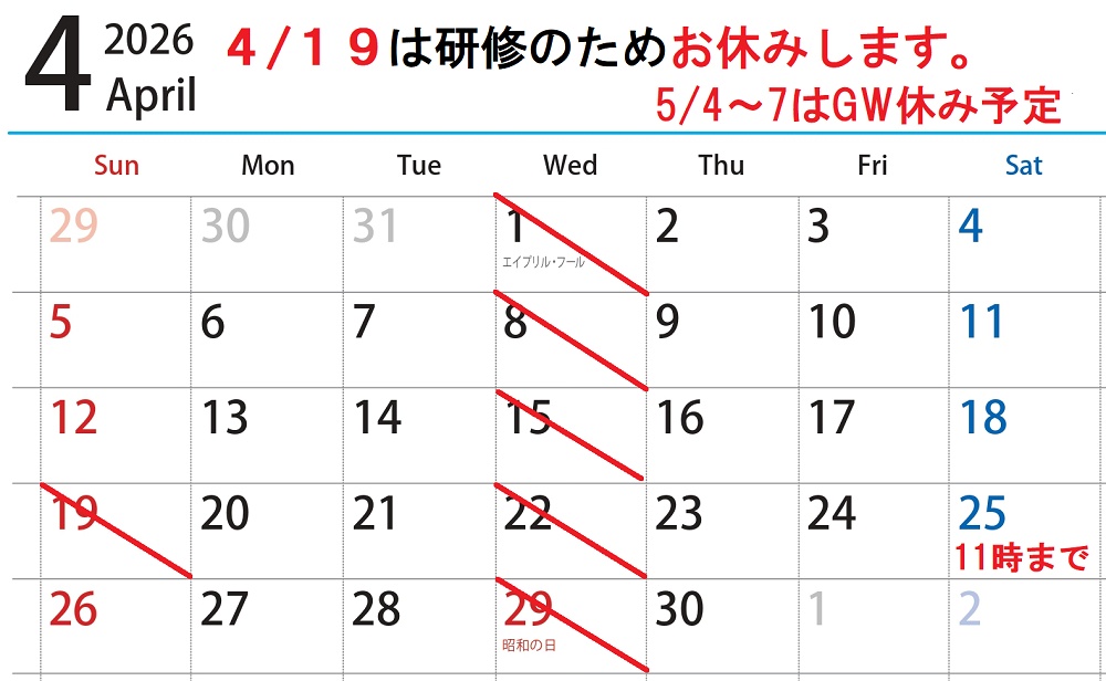 4月は水曜・祝日を含め1,8,15,19,22,29がお休みになります。